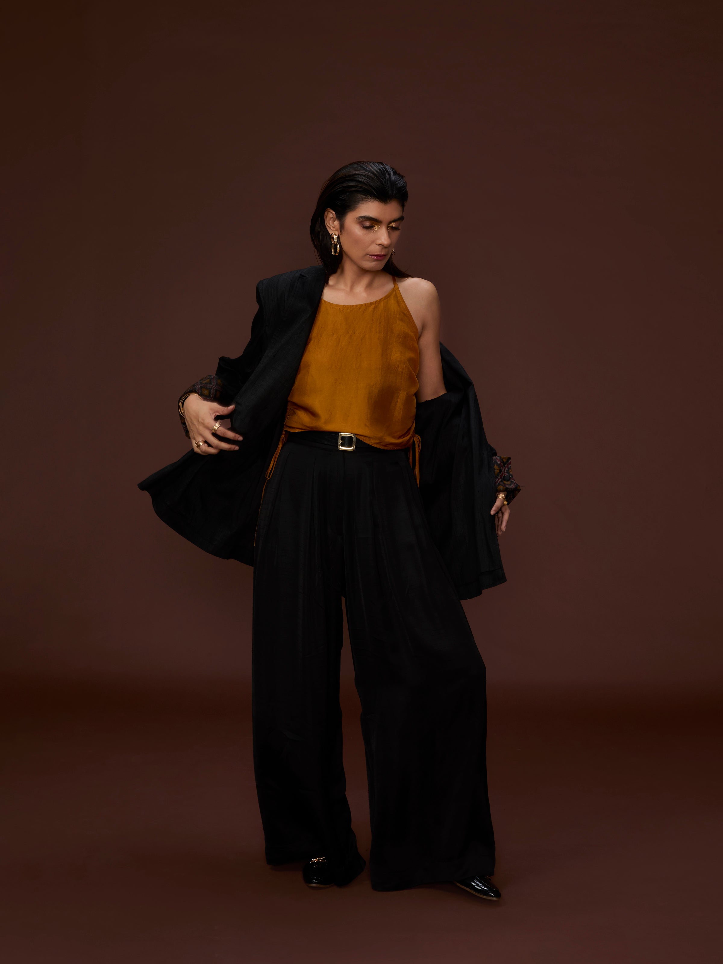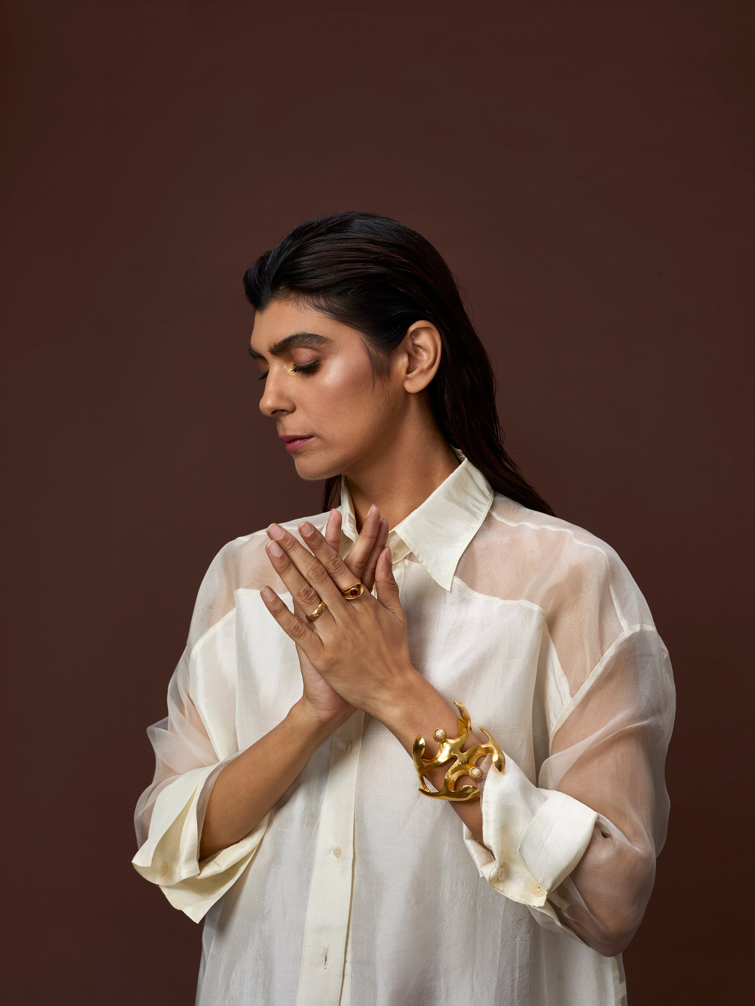 Crafted from the finest silk, this luxurious shirt drapes fluidly over the body, offering a rich, lustrous finish. Sheer silk organza sleeves and back lend an ethereal touch, their subtle sheen contrasts beautifully with the solid silk front. Billowing sleeves taper at the wrists, while the sheer back offers a delicate reveal - elegant yet quietly seductive. This piece exudes timeless sophistication, perfect for the refined wearer.